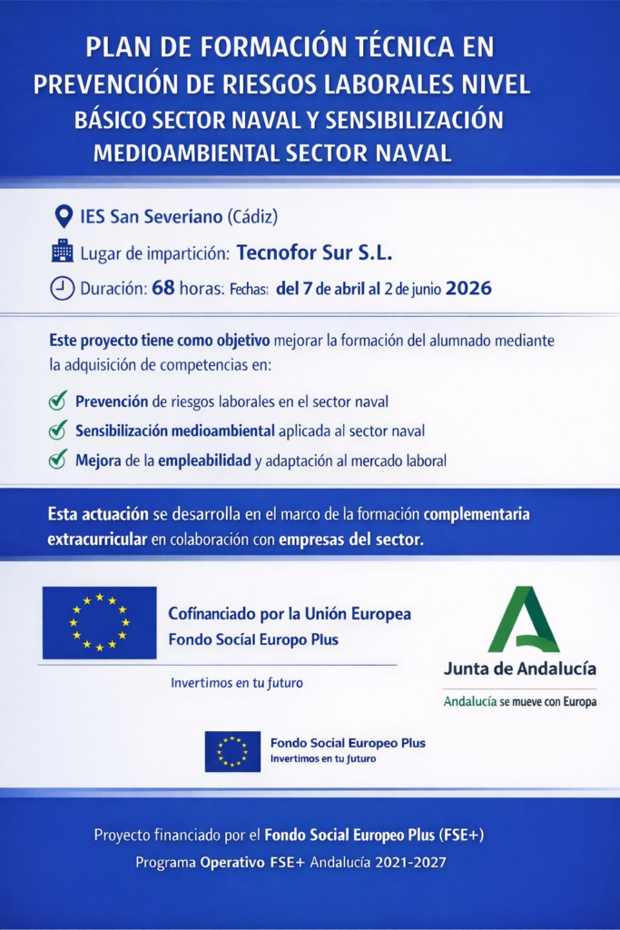 Esta actuación formativa se realiza en colaboración con el centro de formación Tecnofor Sur S.L., en Cádiz, y tiene una duración total de 68 horas.